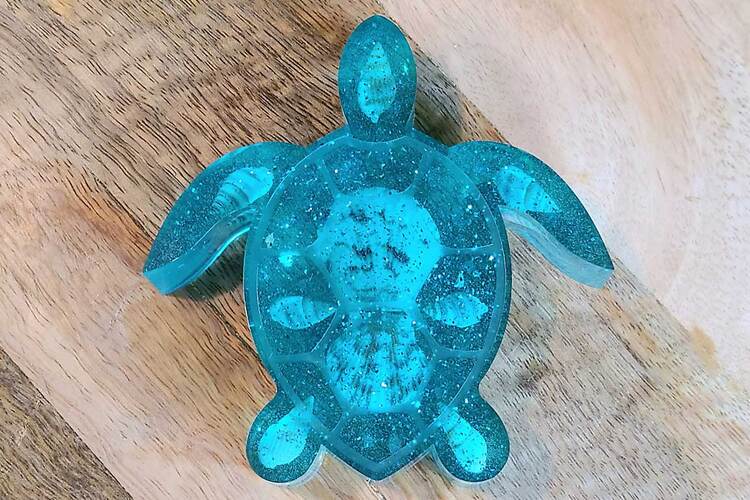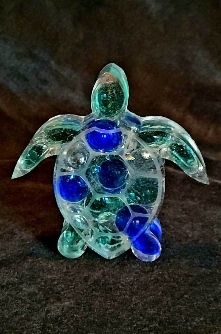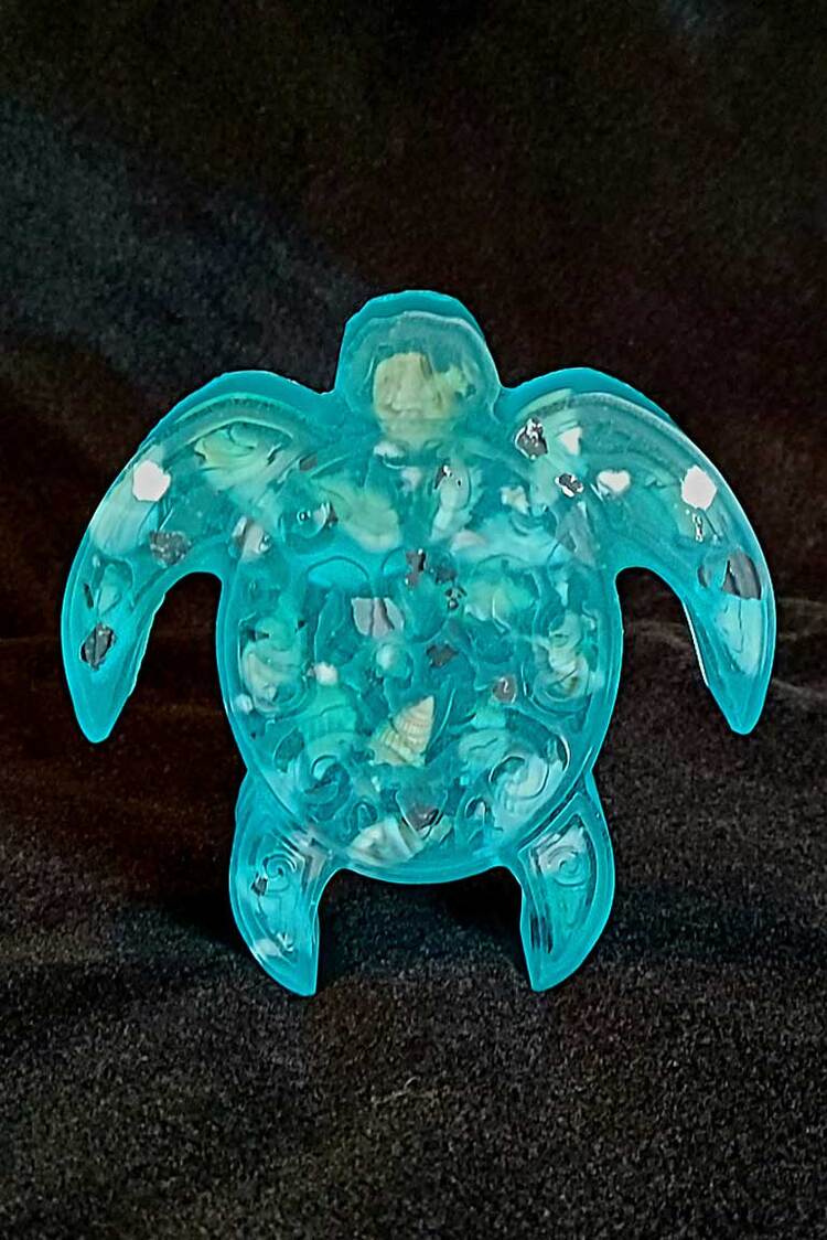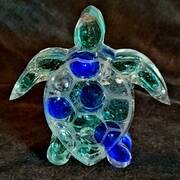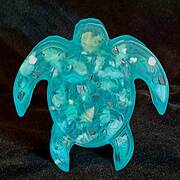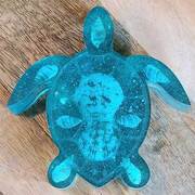 Thick turtle with genuine seashells and sparkling mirrored pieces, pale aquamarine in color. approximate size = 4 &1/4" x 4 &1/8" x1"