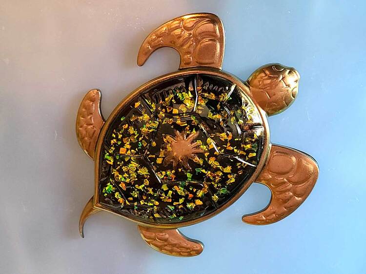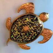 Large metallic, multicolored turtle in shades of blue, green and reddish. Black backing, Piece can lay flat on surface or be mounted to hang on wall with a hanger. Approximate Size = 7.25"x6"x1"