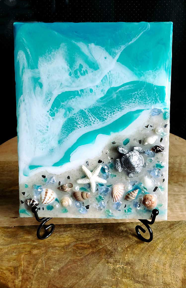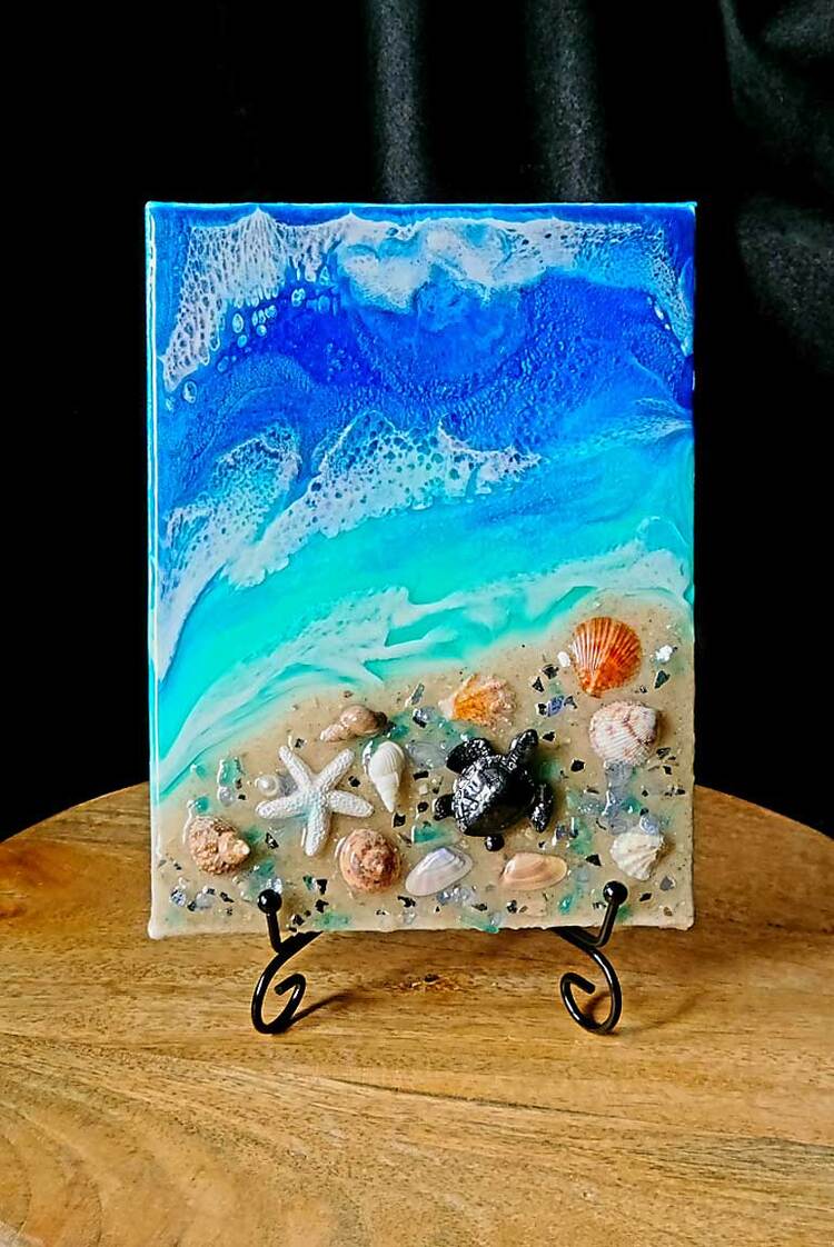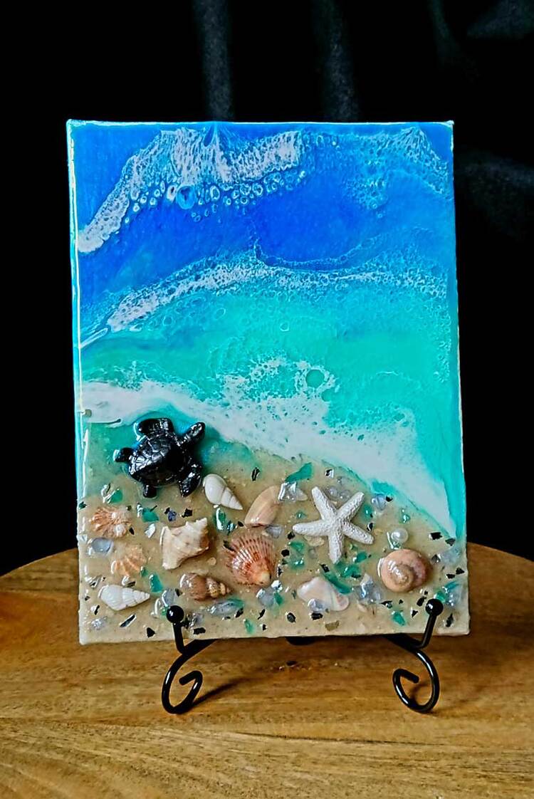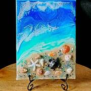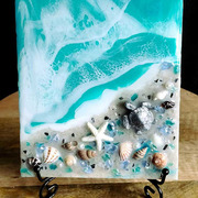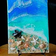 5"x7" Coastal Canvas featuring an ocean and beach scene with genuine shells and beach sand. Includes a 6" black metal display stand.