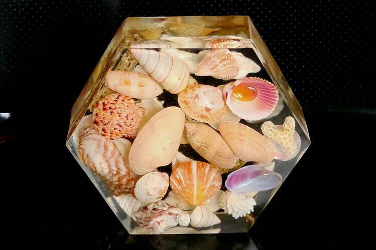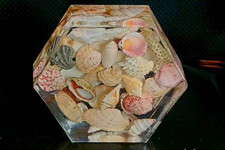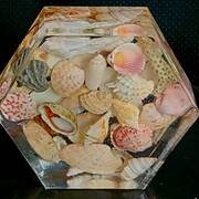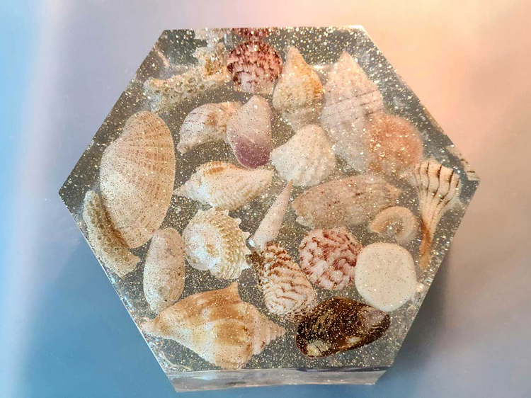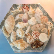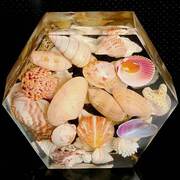 Substantial Showstopper Piece that is 2" thick in the shape of a hexagon that is filled with over 25oz of clear resin with genuine beautiful seashells suspended within. With or without gold glitter accents embedded into the resin. Item can be displayed and viewed from either side. Specify with or without glitter accents when ordering.