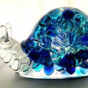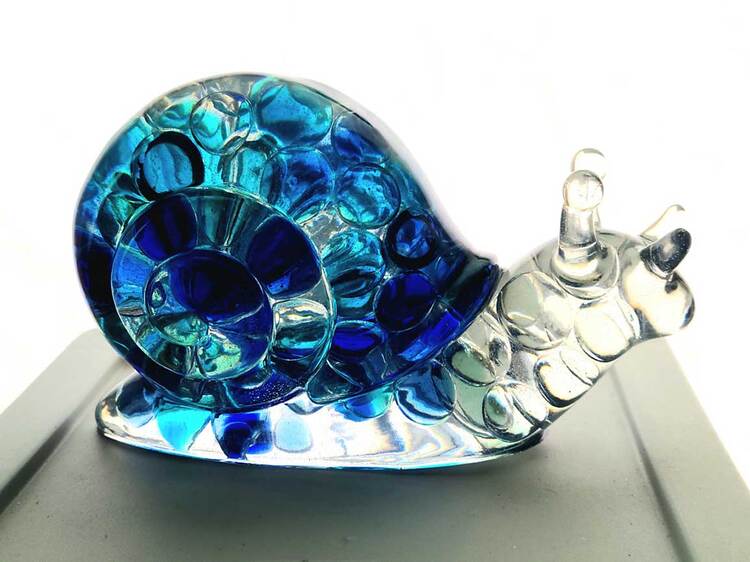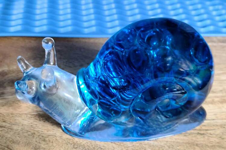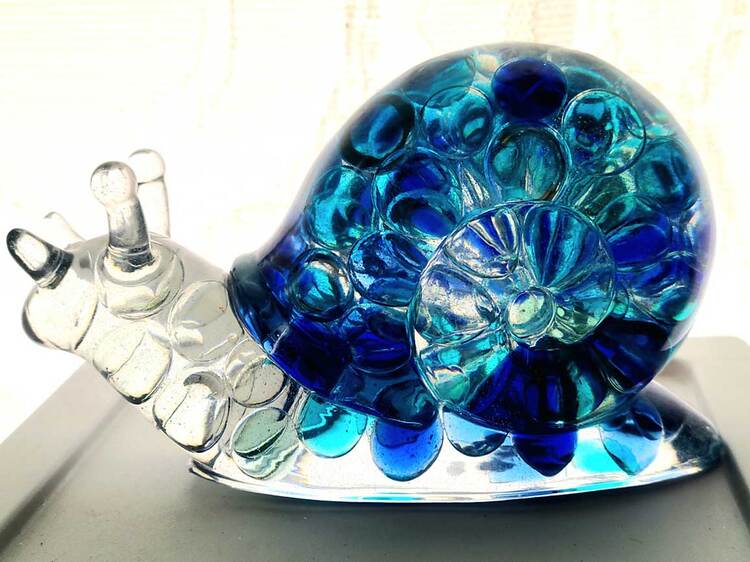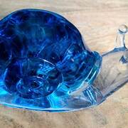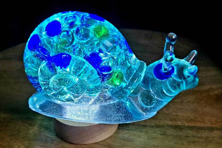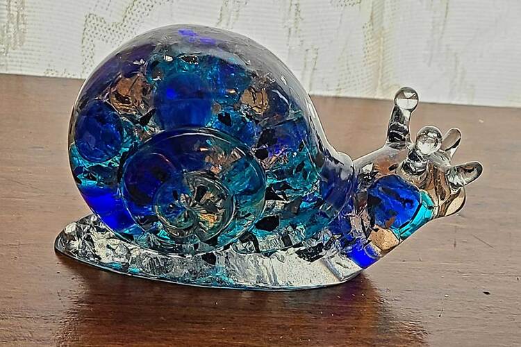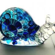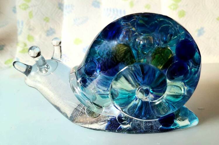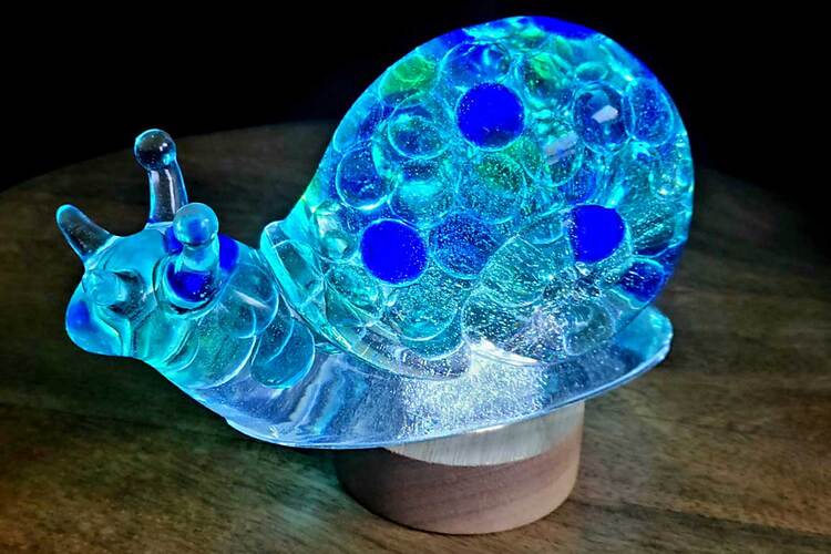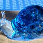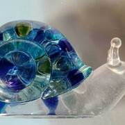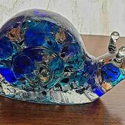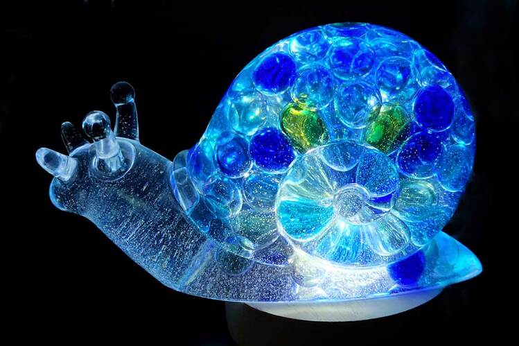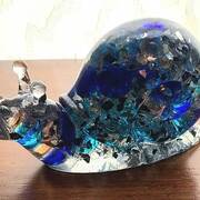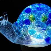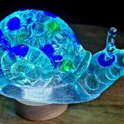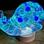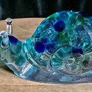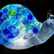 Large Snail Figurine, clear with shades of blue and clear marbles creating a beautiful array of water color tones. Item shown has a USB light up display beneath the snail that is NOT included with the snail purchase. Light can be purchased for an additional $10. USB to A/C adapter plug for an additional $6. Approximate size Snail = 6.25"x2.5"x3.75"