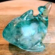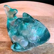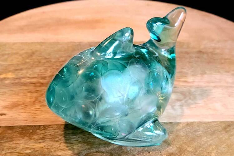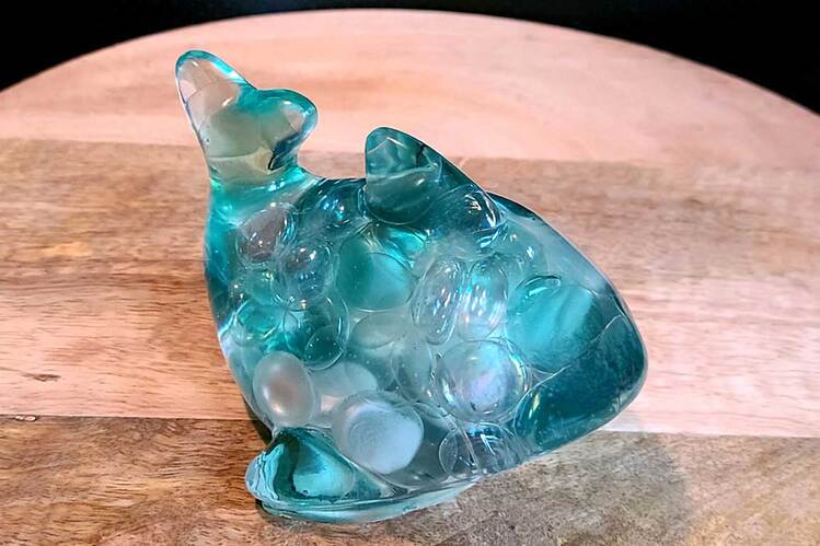 Dolphin figurine/paperweight filled with clear or tinted resin and embedded with colored glass pieces or other additives.Approximate Size = 5"x4"x3.25"