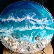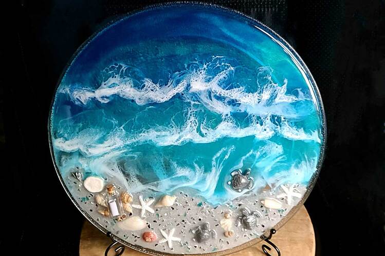 Extra Large round Ocean Scene Display Plate with water and beach. Features a coastal ocean scene with genuine seashells, crushed glass & mirror pieces, and beach sand. Many pieces also have from 1 to 3 sea turtles in the sand. Some pieces also have a glass message in the bottle in the sand. Includes a 10" black metal easel display stand.