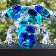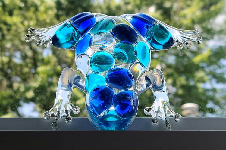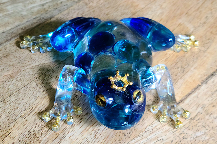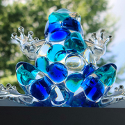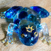 Clear Frog with turquoise blue, cobalt blue, and clear marbles. Sparkly toes with gold or silver stones! Clear Frogs with tones of blue shades of marbles embedded into the resin. Choice of 1, (one) Frog. Very cool! They look especially amazing when near a window, light source, lit from beneath or with light coming from behind. Price is for 1, (one) frog. Approximate Size = 5.25"x4"x1.33"