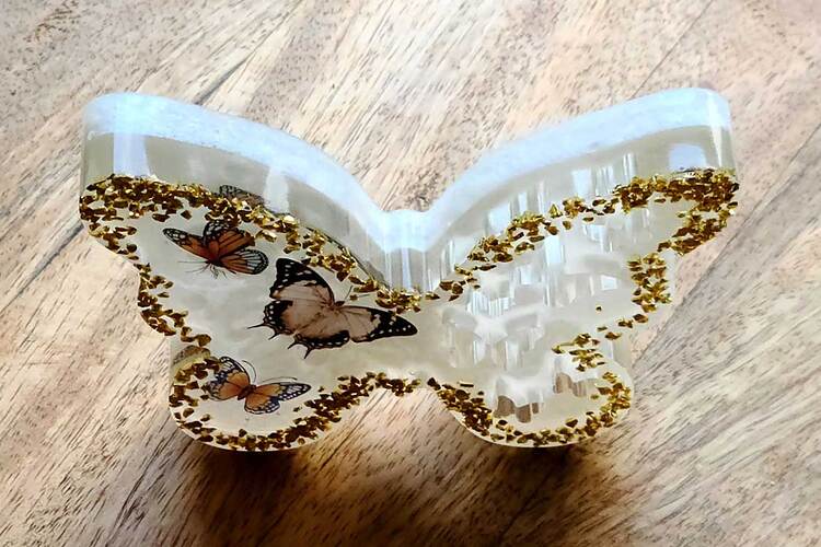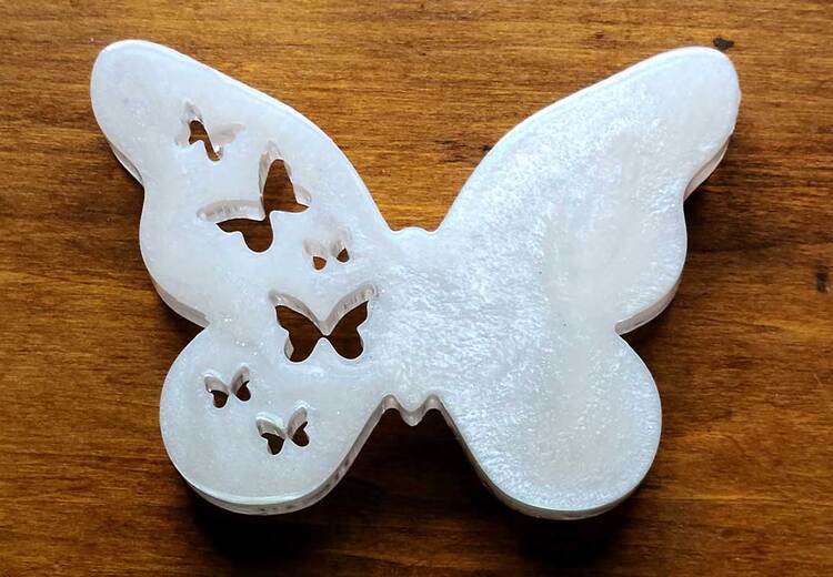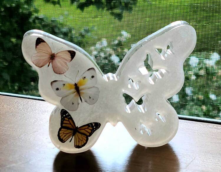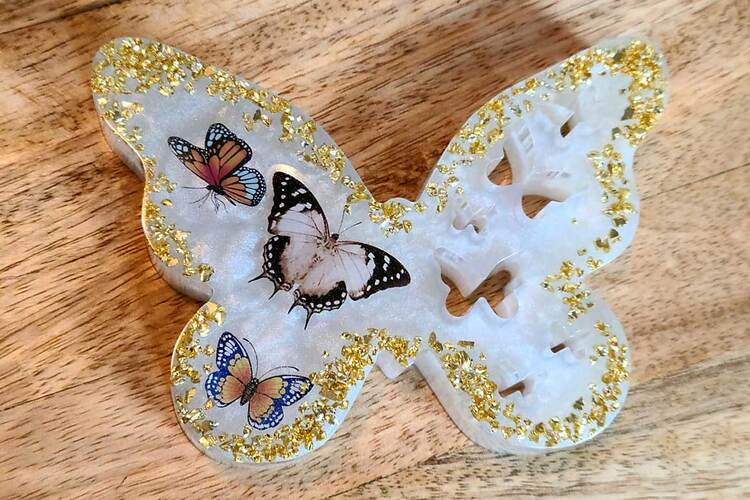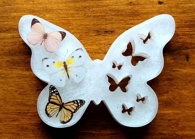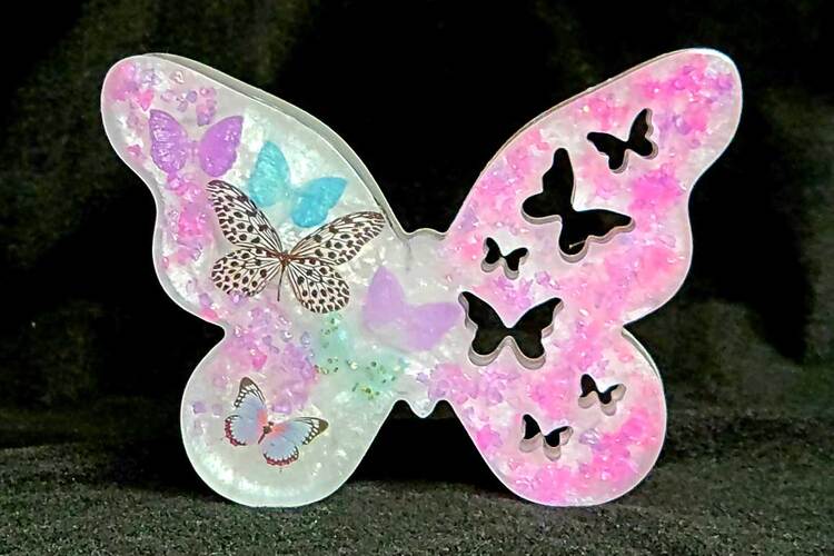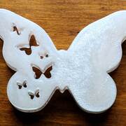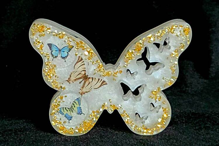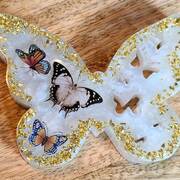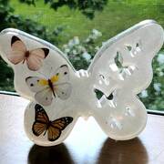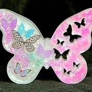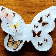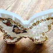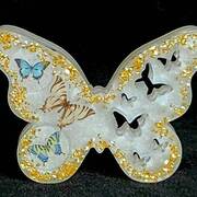 Beautiful Pearl colored Butterfly with 3 colorful butterflies on one side and tiny cut out butterflies on the other side. Approximate Size = 4.5"x3.5"x.75"