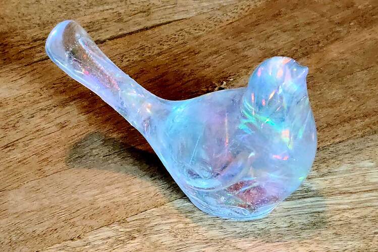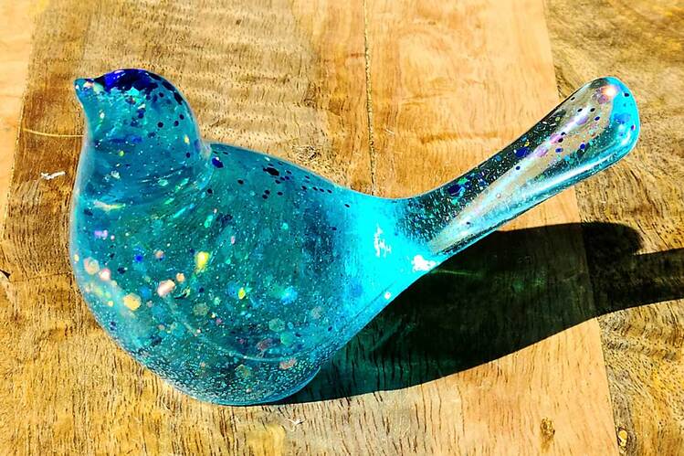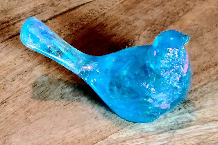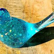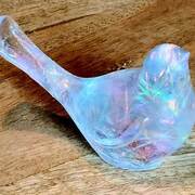 Translucent Bird figurine with embedded complimentary colored accent glitters, iridescent with multi colors embedded, or various embedded embellishments or additives. Price is for 1 (one) bird Approximate Size = 4.5"x2.75"x2"