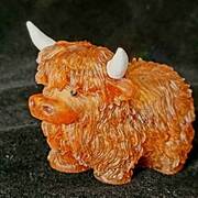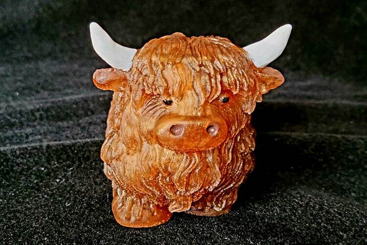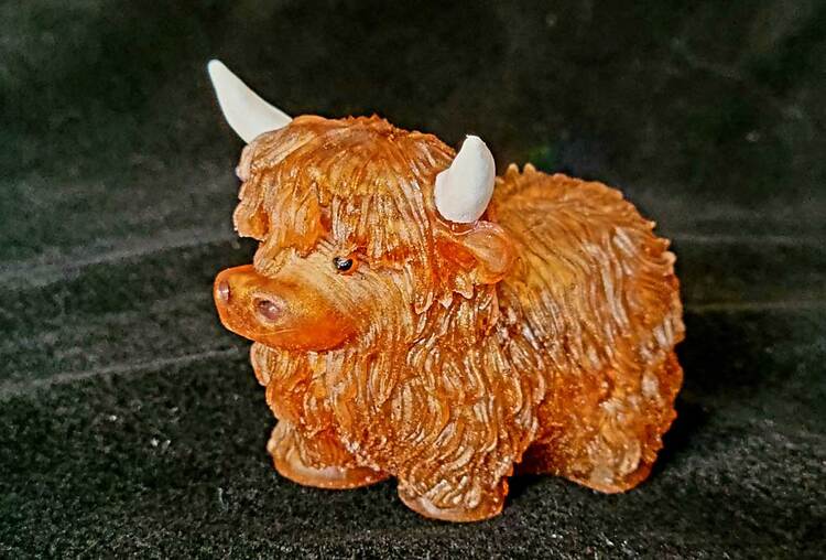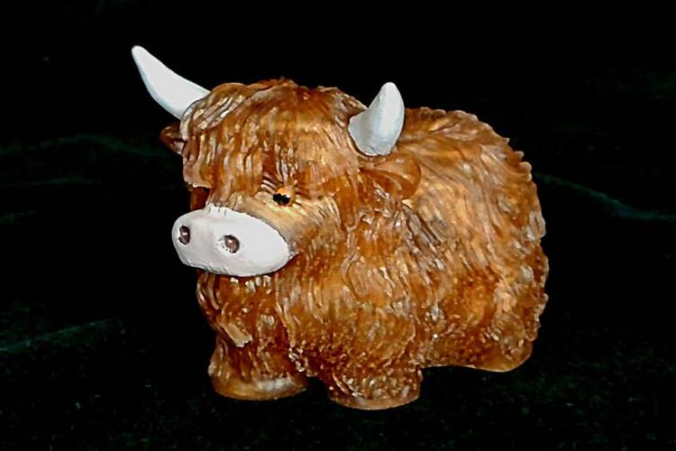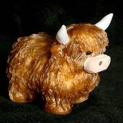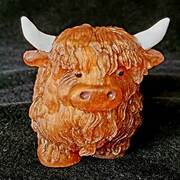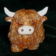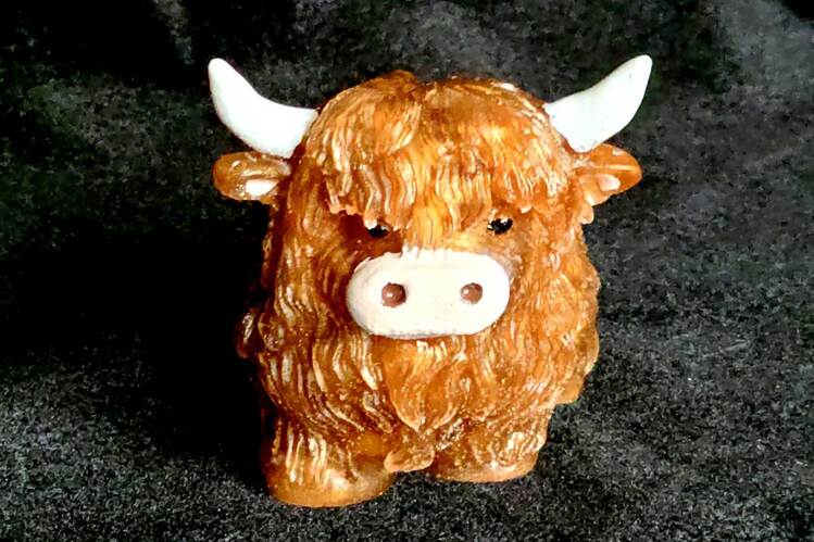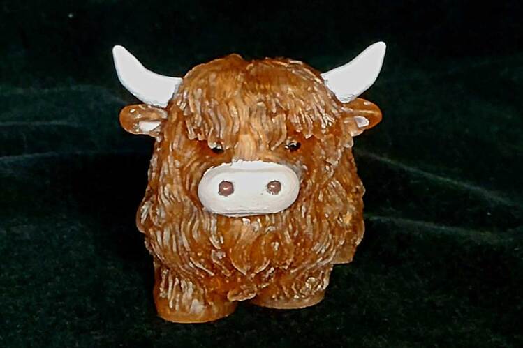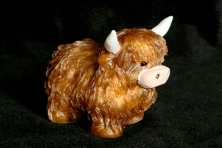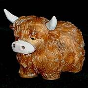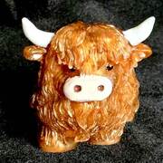 Adorable Highland Cow figurine with hand painted detail on horns, ears, snout and eyes. Finely detailed fur texture. Approximate Size = 2.75"x2.75 x2.35"