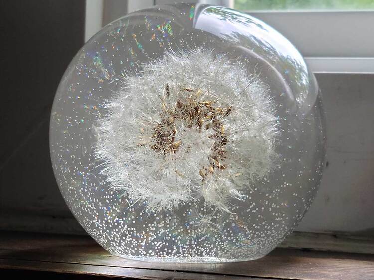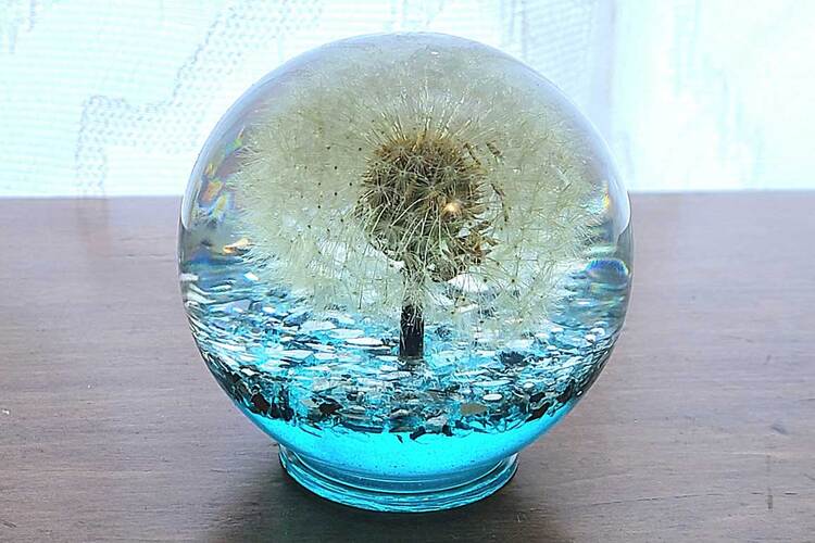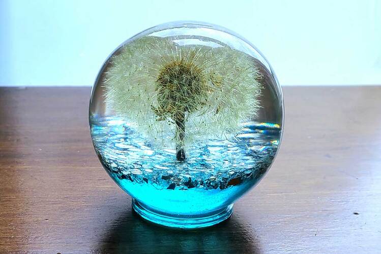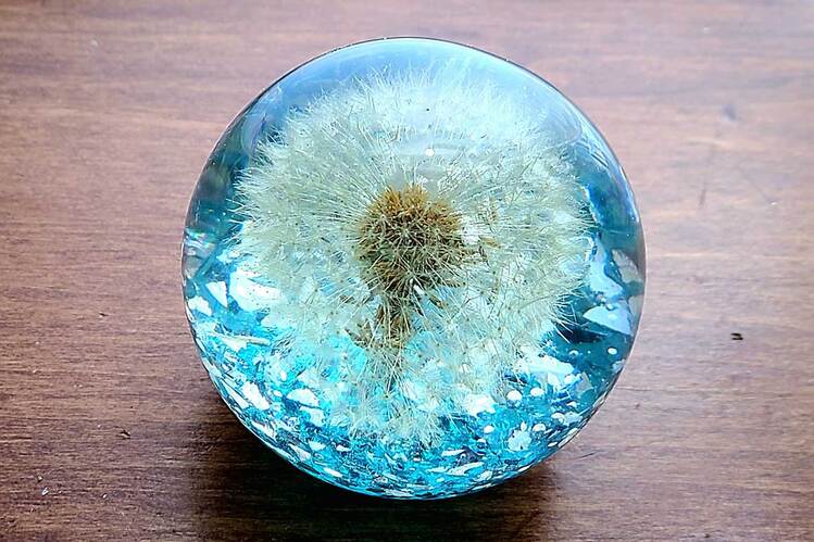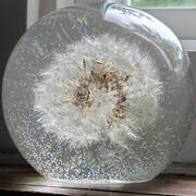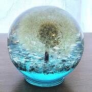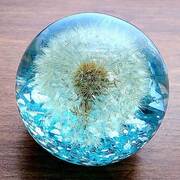 Extra Large Round Paperweight with genuine dandelion encased in clear resin or translucent color with a pearl gray metallic and crushed mirror accent bottom. Looks very cool sitting near a window where it is flooded with light or on top of a lighted base! (***Lighted base not included) Approximate Size = 3 1/8"x3"x3 1/8"