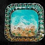 Miscellaneous sized Trinket Trays feature a Coastal theme on antique glass. Pretty pieces are created using water colored hues & sprinkled with real sea shells, crushed glass and mirror pieces. Can be used as a decorative piece and/or a functional piece to hold jewelry or other trinkets. Approximate sizes: Sizes vary from 4"x4"round, 4.5"x4.5"" square, 7" or 8"x3" rectangle, 8"x3.5" rectangle,4.5"x4.5" round, 5"x5"round, 5.5"x5.5" round, to 5.75"x5.75" round. Trinket Trays & Bowls are priced according to their size with a price range from $15-$30 each. Most are priced at $20 or $25.